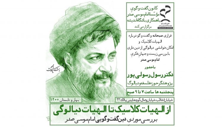 کانون گفتوگوی مؤسسۀ امام موسیصدر با همکاری باشگاه اندیشه سلسله درسگفتارهای «از الهیات کلاسیک تا الهیات دیالوگی» را با حضور دکتر رسول رسولی پور، استاد فلسفه دانشگاه خوارزمی و دین پژوه و دیالوگ پژوه برجسته در فصل تابستان برگزار میکند.