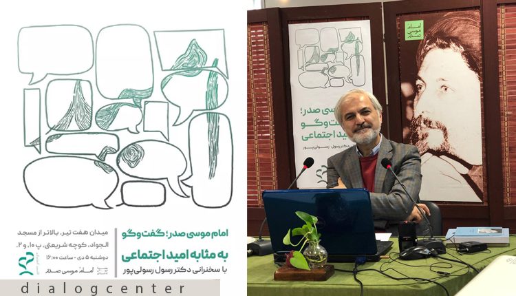 دکتر رسولیپور در ادامه جلسه گفت: أساساً دین امام موسی صدر دینی گفتوگویی (dialogical religion) است. منطق گفتوگویی در نقطۀ کانونی آرای امام موسی صدر قرار دارد. منظور از گفتوگو صرف همسخنی و یا تبادل آراء و آموزه ها نیست، بلکه نوعی همافزایی در حل یک معضل است؛ این معضل میتواند معضلی دینی در معنای تعارض باورها و عقاید، معضل و بنبست سیاسی، معضل نظامی و جنگ و خونریزی و یا معضل اقتصادی باشد. امام موسی صدر معتقد است «باید نگرش منحرفی که اهتمام به وضعیت محرومان را از امور سیاسی میشمارد و دخالت در آن را برای عالِم دین جایز نمیداند، اصلاح کرد.»